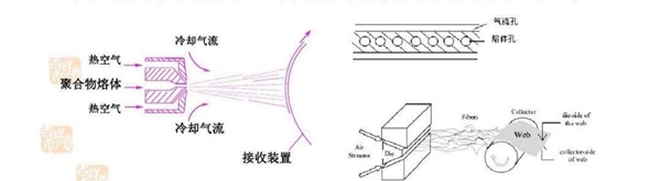 熔噴布的生產(chǎn)工藝便是熔噴非織造工藝,利用高速熱空氣對(duì)模頭噴絲孔擠出的聚合物熔體細(xì)流進(jìn)行牽伸,由此形成超細(xì)纖維并凝聚在凝網(wǎng)簾或滾筒上,并依靠自身粘合而成為非織造布。