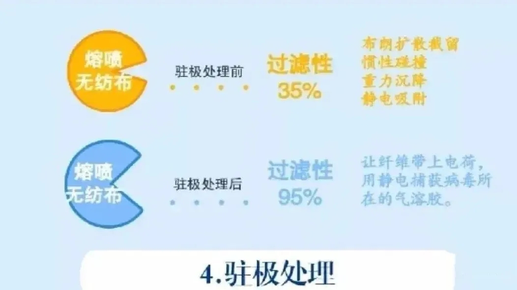 從生產原理上來說,熔噴布是由熔噴級聚丙烯,經塑化熔融,高溫高速噴出細絲,在空氣中自然冷卻形成。 這樣噴出的布,相當于一張由直徑范圍0.5~10 微米的超細纖維,交叉層疊成的纖維網,密度小到可阻絕粉塵、攜帶病毒和細菌和飛沫。同時,經過駐極處理后的熔噴布,還增加靜電吸附功能,飛沫靠近熔噴布后也會被靜電吸附在表面,提高濾效。
