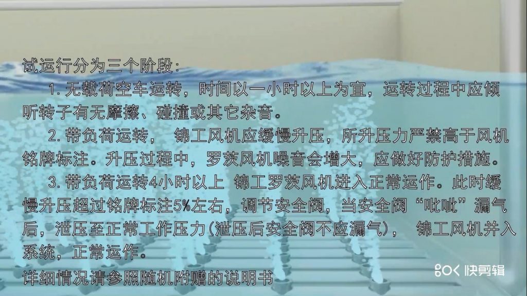 相關人員遠離鼓風機機組2米以外,進行開機試運行,試運行分為三個階段: