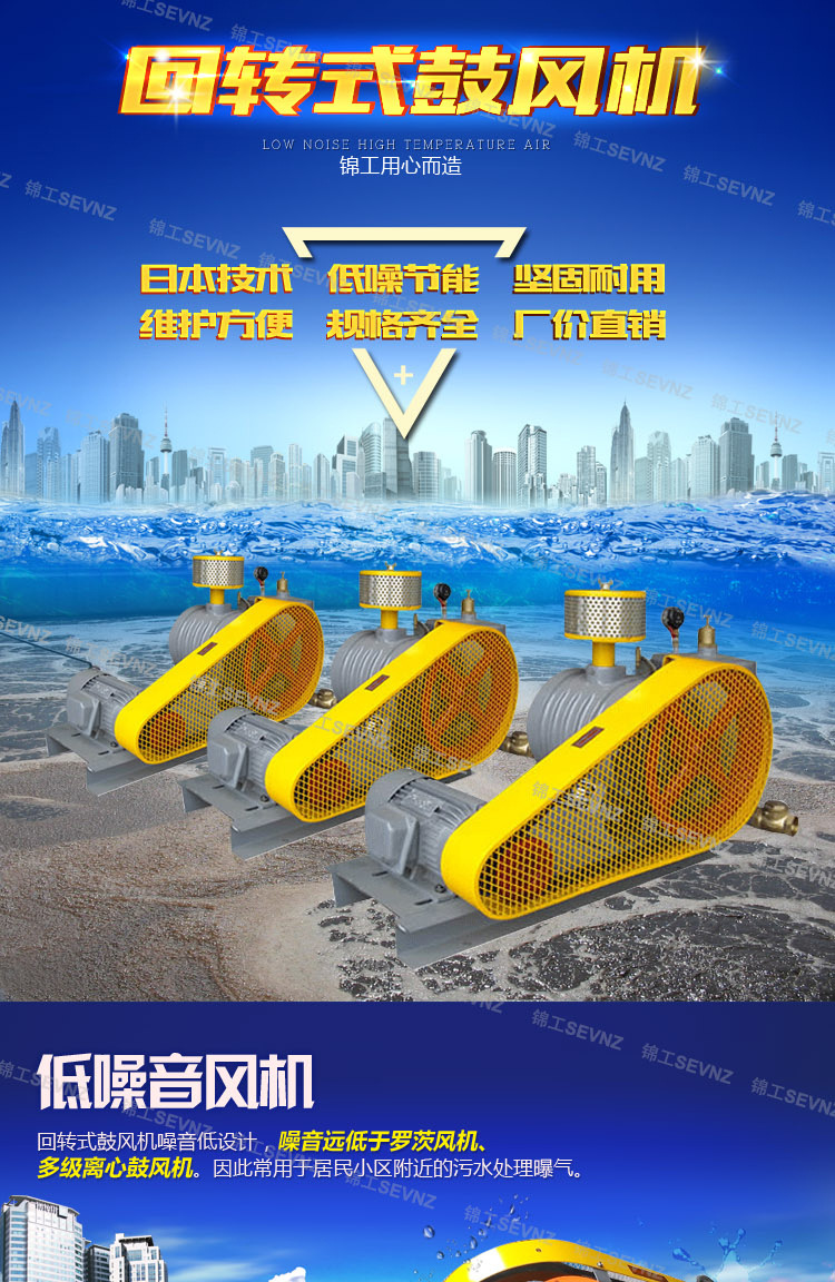產品簡介: 回轉式風機是變容壓縮,其主要特點是:低轉速,低噪音,低振動,高效率,高節能。