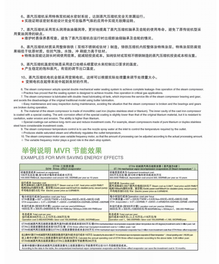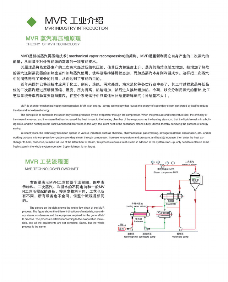 MVR是機(jī)械蒸汽再壓縮技術(shù)(mechanical vapor recompression)的簡稱,MVR是重新利用它自身產(chǎn)生的二次蒸汽的能置,從而減少對外界能源的需求的一項(xiàng)節(jié)能技術(shù)。